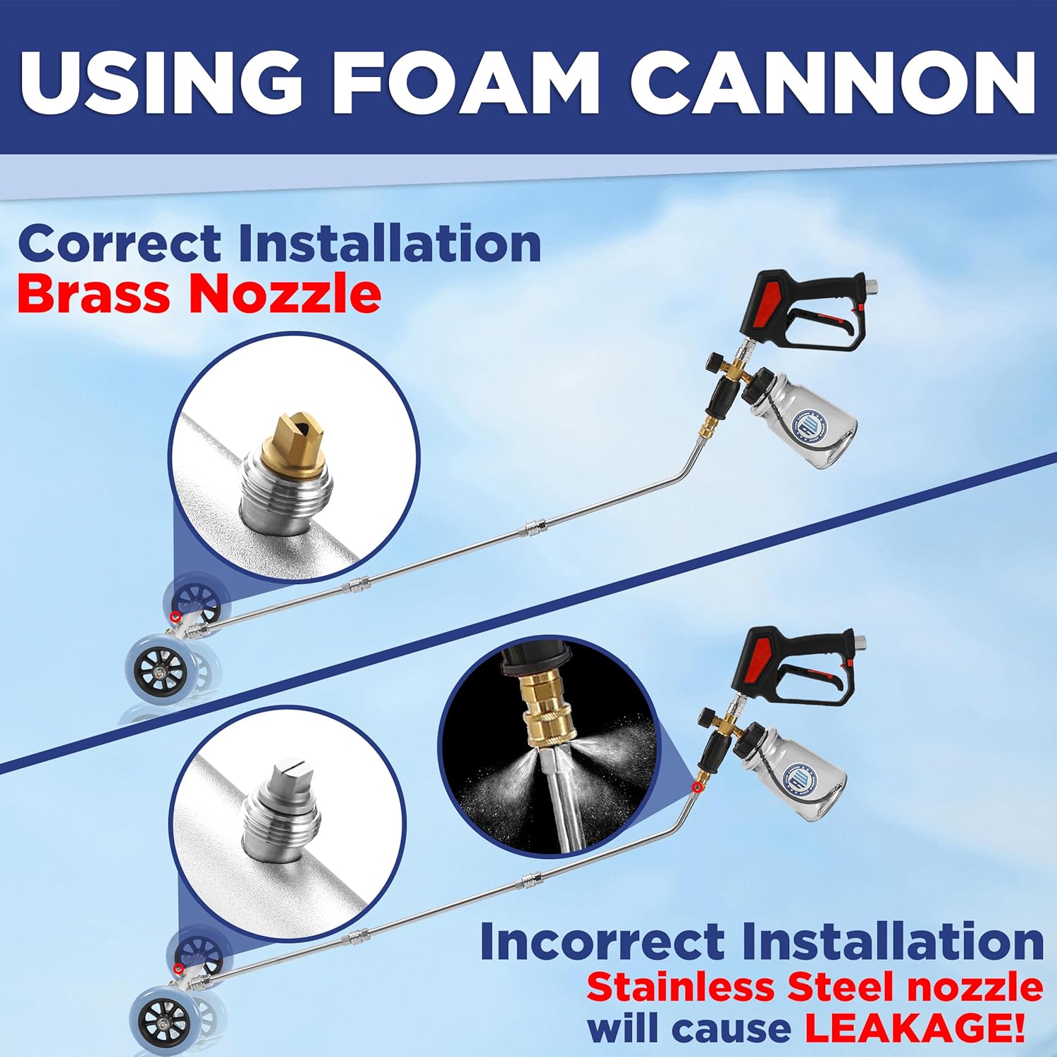 WARM REMINDERS: For simultaneous operation of the undercarriage spray tool and foam cannon, opt for the large-aperture brass nozzle designed for vehicle underbodies. Utilizing the small-diameter stainless steel nozzle may result in spills at the foam cannon's interface with the pressure wand.